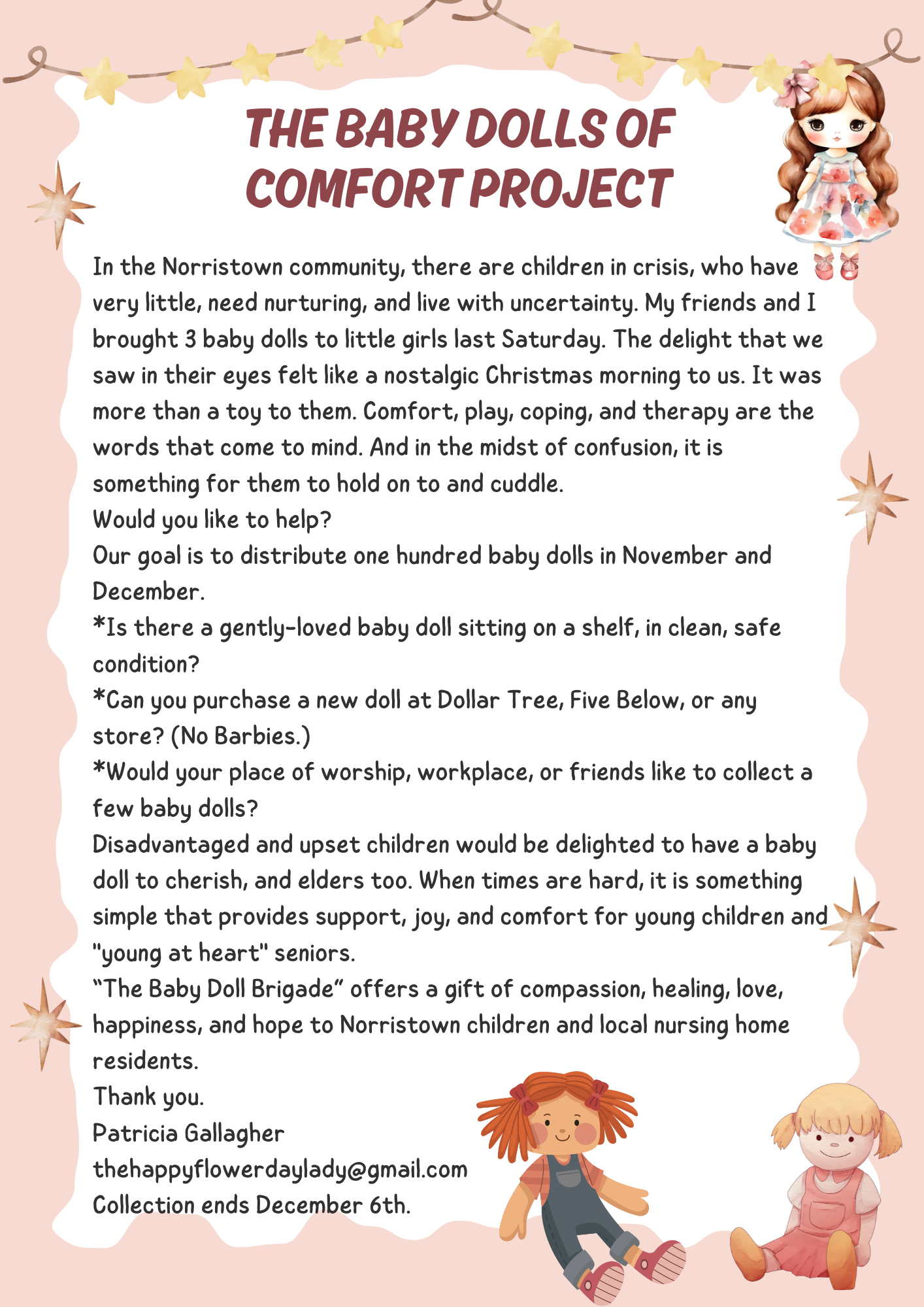 Deciding she couldn’t go empty-handed, Patricia and her mother gathered together some props; snow globes and bells and wreaths, and stuffed animals that used to belong to her children.