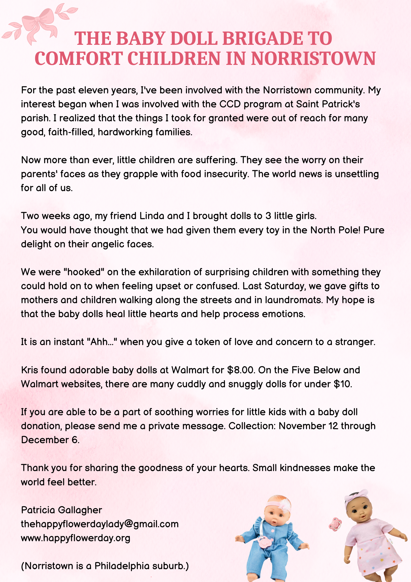 “It was December 1st [2009] and I was feeling out of sorts,” explains Patricia. “I said to my mother ‘why don’t we go to the dollar store, buy 10 copies of ‘Twas the Night Before Christmas’ and I’ll call a couple of nursing homes and see if we can go over and read the stories to the residents.”